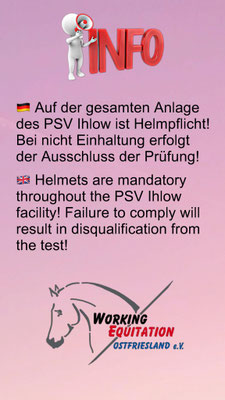 Wir haben ein paar Wichtige Information bzgl. unseres Turnier Ende des Monats. Der PSV Ihlow (Inhaber der Anlage) schreibt in seinen Hausregeln vor: Alle Teilnehmer sind verpflichtet aus Sicherheit einen Helm zu tragen, unabhängig vom Alter. Wer sich nicht an die Vorgaben hält wird an den Prüfungen nicht teilnehmen können.